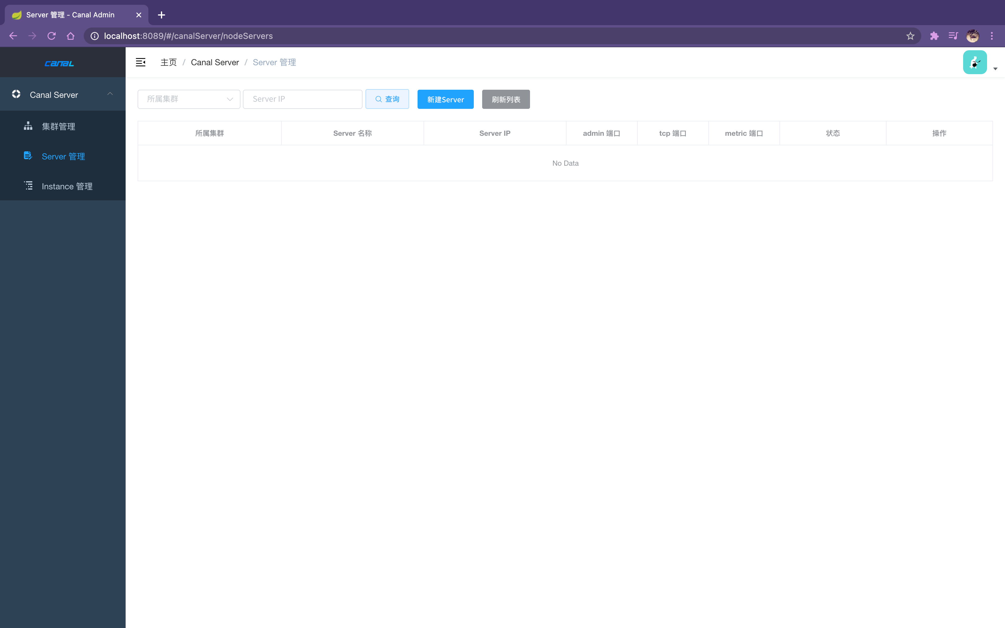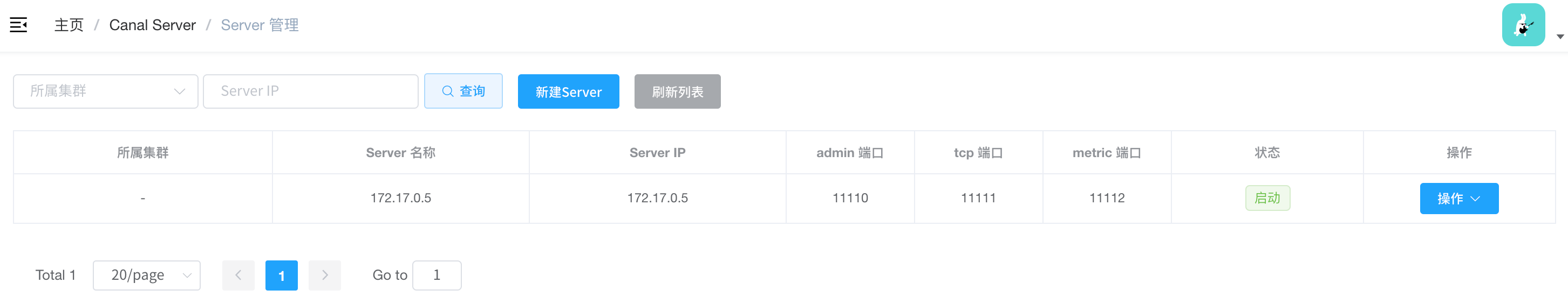 启动成功后,刷新admin页面的server列表,会出现刚刚启动的canal-server: